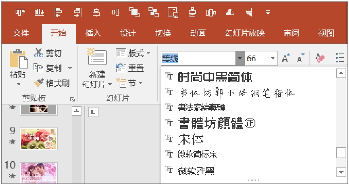 选择不同的字体、应用不同的字体搭配方案,能够让PPT 呈现出丰富多样的效果。在互联网中可以找到海量的字体,下载安装后,打开PPT,在字体下拉列表中选择相应的字体(见图3-1),即可将其应用至当前选中的文字,非常便捷。然而,安装过多的字体会造成软件载入慢、操作卡顿等问题。我们常用的字体并不多,选择和掌握一些优秀字体的用法对于PPT设计其实就已足够。