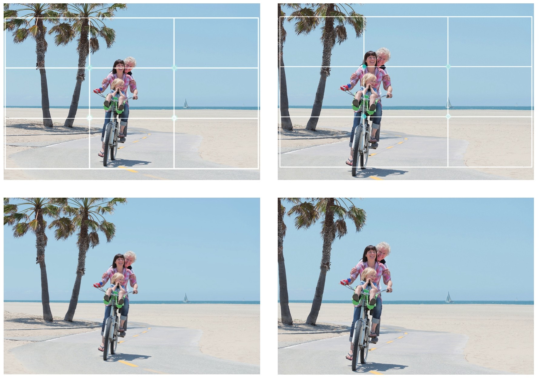 如图1-7所示,画面中祖孙三代在快乐地骑自行车,但是整个主体偏离了交叉点,让人感觉画面不灵动,没有体现出速度感,而运用三分法构图调整后就会好很多。