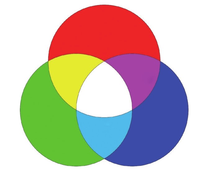 每一个原色都有0(黑)至255(白)共256个值,三个原色不同的值组合在一起,可以得到16777216种颜色,这就是明明只有三个原色,却可以在显示器上呈现出五彩斑斓的影像的原因。RGB模式之所以叫加色模式,也是因为其光色混色的特点,三个原色互相叠加会越叠越亮,最后得到白色,如图1-14所示。