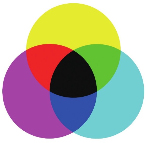 CMYK模式是一种印刷模式,由青(Cyan)、洋红(Magenta)、黄(Yellow)、黑(Black)组成。它与RGB模式刚好相反,属于减色模式,因为CMYK模式的三个原色互相叠加是越叠越暗的,如图1-16所示。