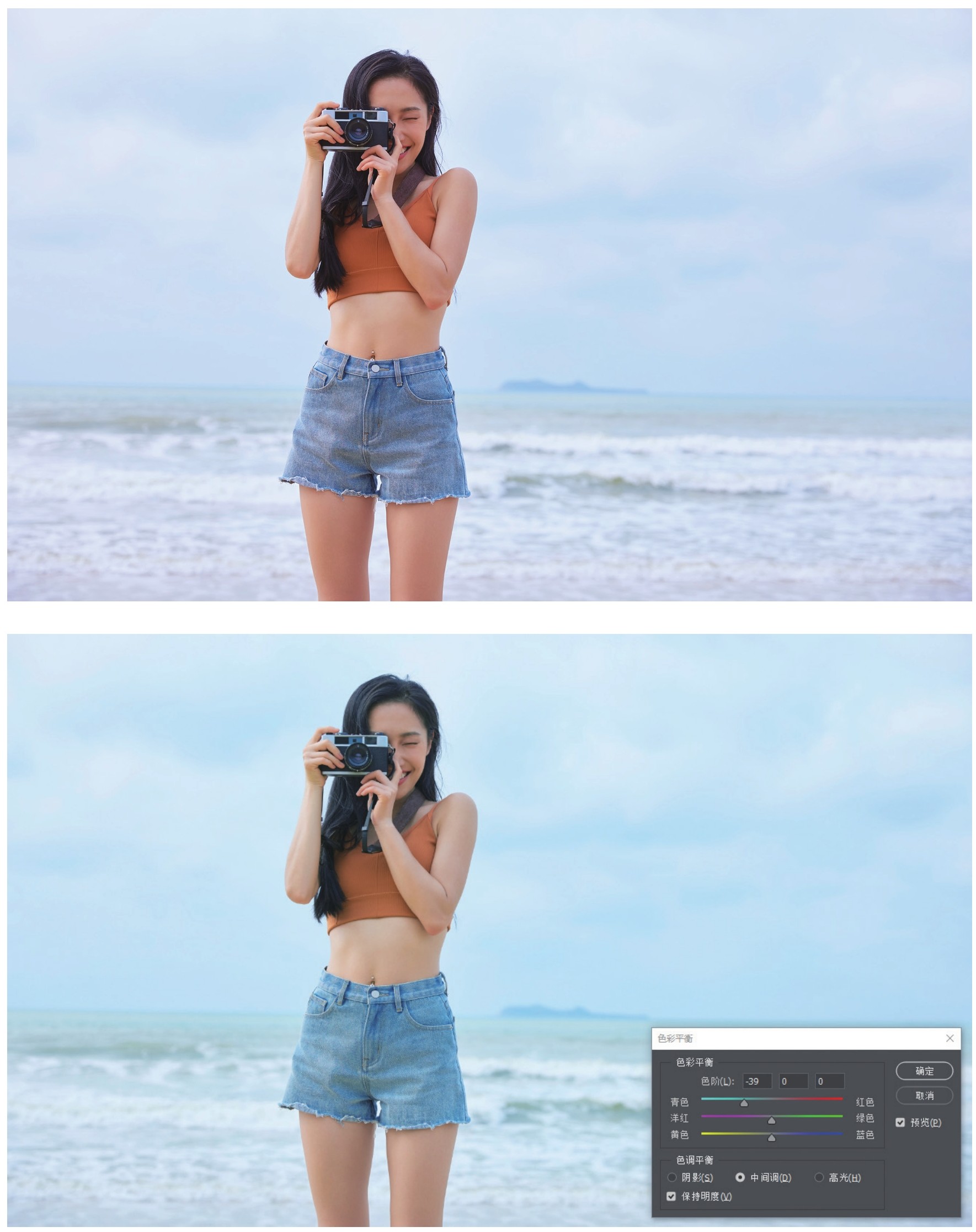 如图1-20所示,原图是一张暖色调的海边少女图,我们用色彩平衡为它加青色,青色与红色互为补色,所以红色就会被弱化,而青色则被强化,照片便会由暖色调转为冷色调。注意这里红色被弱化不是被减少了饱和度,而是受到了补色的影响。