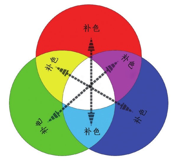 一个原色与另外两个原色叠加混合的间色互为补色,黄与蓝、青与红、绿与洋红就是互为补色的关系,如图1-19所示。