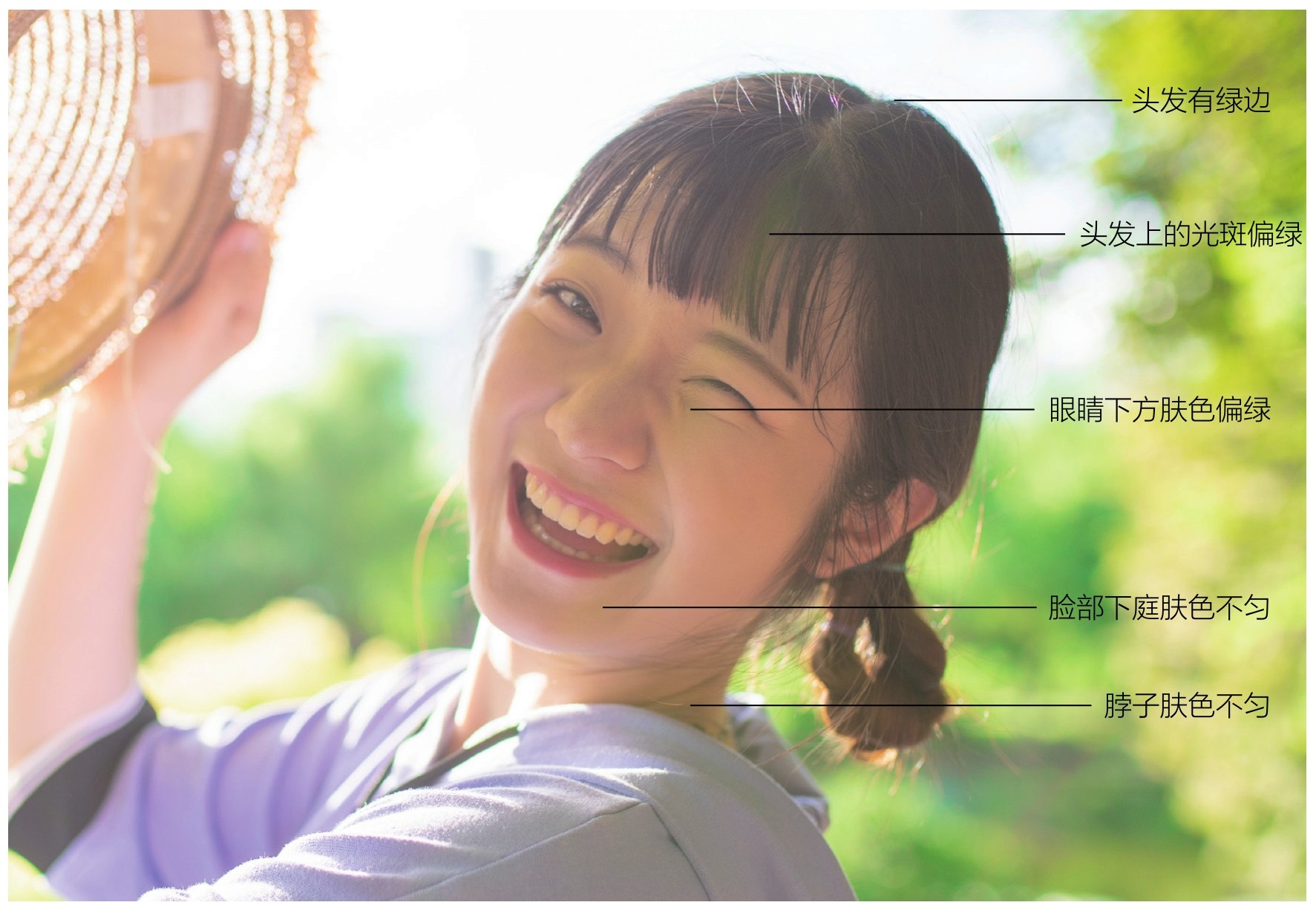 脸部下庭因衣服的颜色反射到脸部,肤色大面积不匀且偏紫。