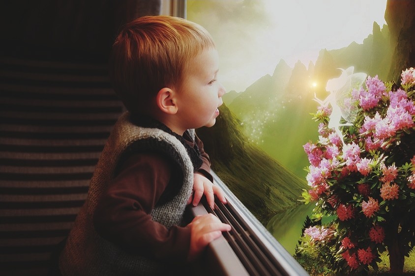如图1-26所示,照片中有一个可爱的小男孩,好奇地看着窗外,对于窗外的景色我们有很大的创作空间。小朋友的世界是多姿多彩且充满想象的,所以我们可以更换窗外的景色,加上一个小精灵与小男孩互动。