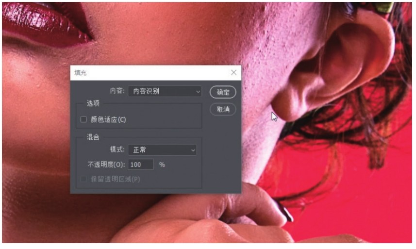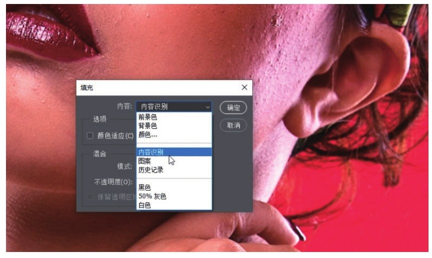 如图2-4所示,用“修补工具”或其他可以创建选区的工具画一个选区,然后按Delete键,弹出“填充”对话框,将“内容”设置为“内容识别”。