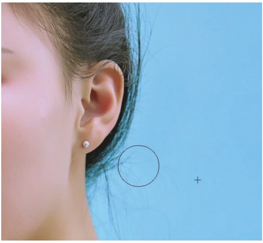 在操作的过程中需要不停地取样,因为计算机没有办法非常精确地帮我们识别需要的区域。我们的拇指可以一直放在Alt键上,按照所需及时按下取样,直至将碎发修干净。