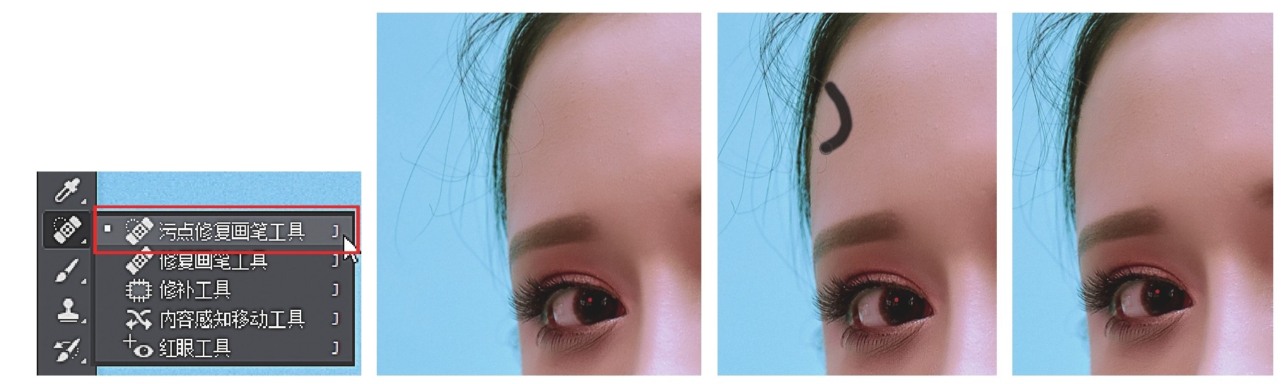 如图2-10所示,像这种额前比较少且稀疏的碎发,可以直接用“污点修复画笔工具”抹掉,在使用时,按住鼠标左键(或用压感笔)直接涂抹即可。
