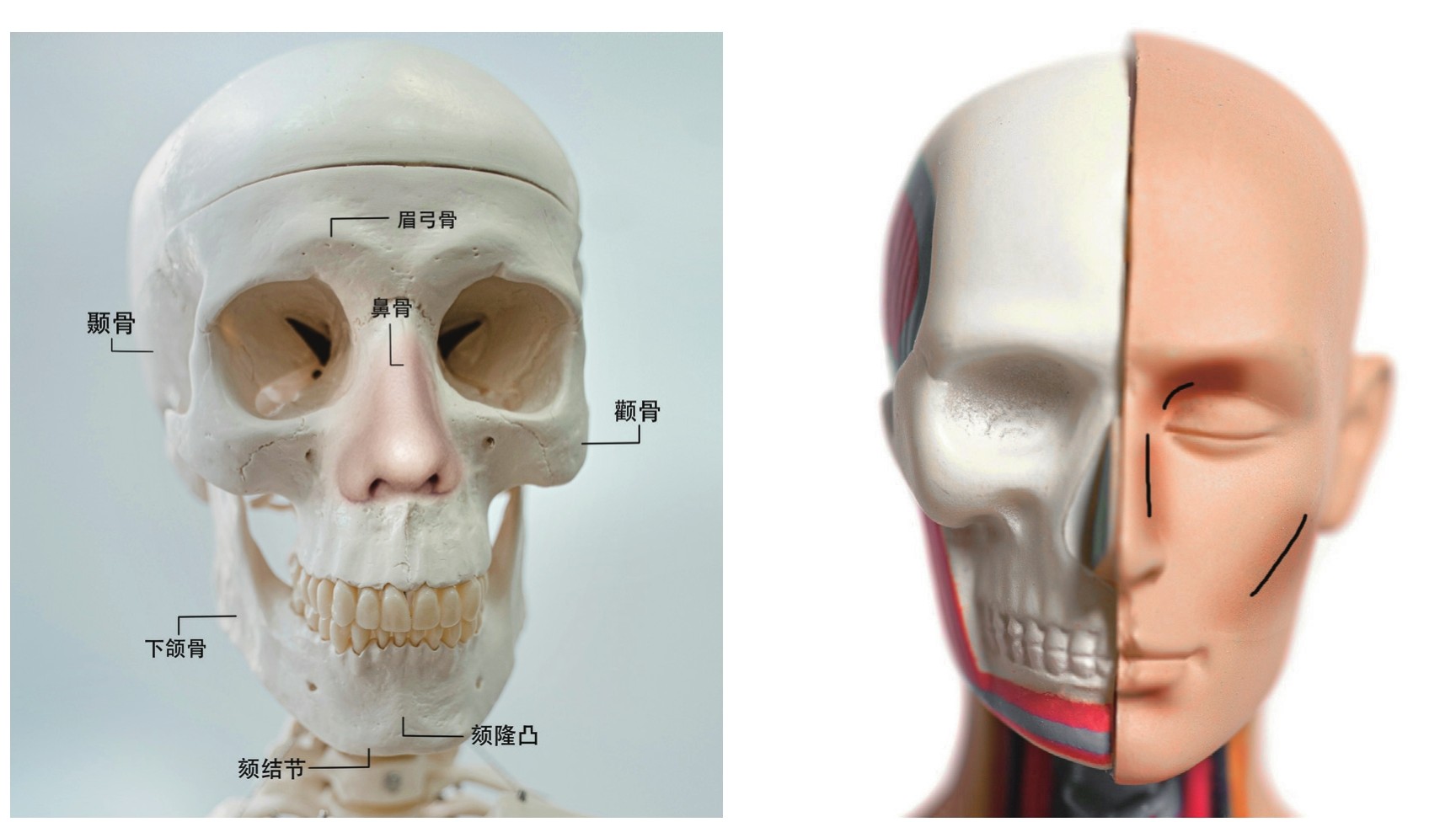 只有让“高山”与“平地”的反差体现出来,才能够看到整个脸部的立体感。在整体磨皮过程中,还要注意这些凸起的骨骼整块的结构,它们不是忽然凸起,而是有着像山坡一样的过渡,这些过渡也是在修图时要注意的细节结构,它们决定着修出的图是否立体、自然。我们先来熟悉这些骨骼的结构。