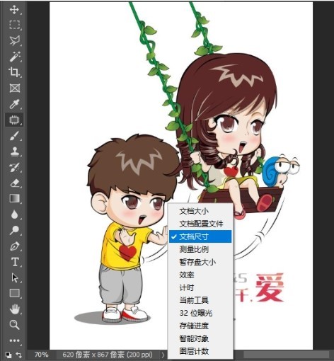 状态栏位于图像窗口底部,显示图像窗口的缩放比例、文档大小、当前使用的工具信息、存储进度等,单击状态栏中的【展开】按钮 ,可在打开的菜单中选择状态栏的显示内容,如图1-17所示。