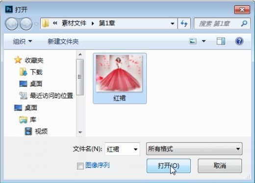 步骤01 单击【文件】菜单,在打开的下级菜单中选择【打开】命令,如图1-25所示,打开【打开】对话框,选择目标路径“素材文件\第1章”,单击【红裙】图像文件,单击【打开】按钮,如图1-26所示。
