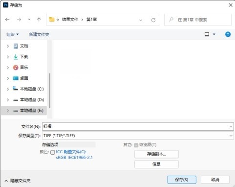 步骤04 打开【存储为】对话框,选择【保存在您的计算机上】选项,存储路径为“结果文件\第1章”,设置【保存类型】为 TIFF(*.TIF;*.TIFF),单击【保存】按钮,如图1-29所示。
