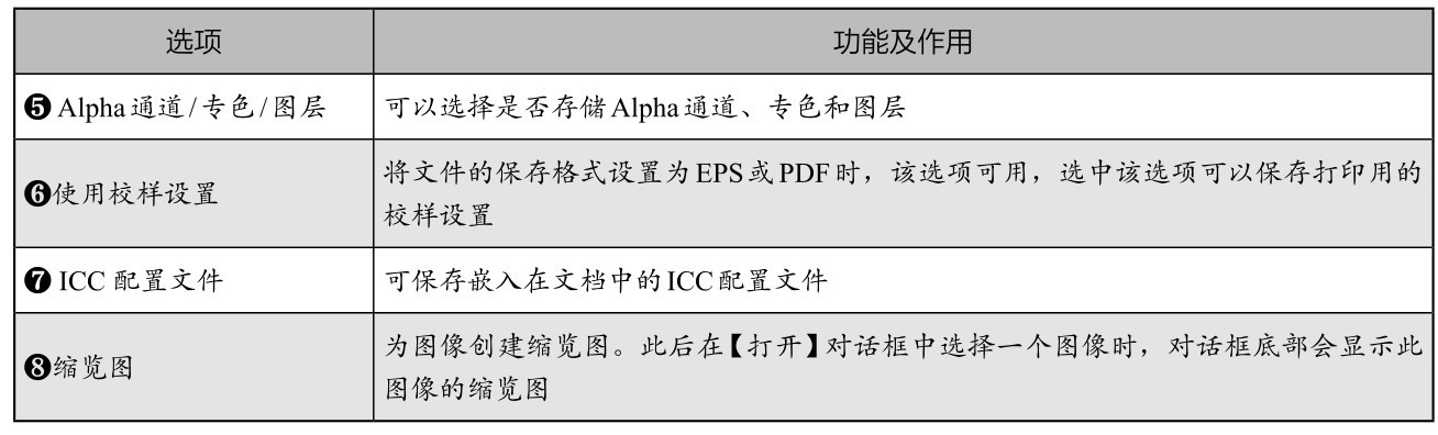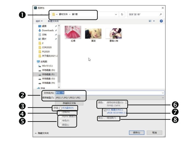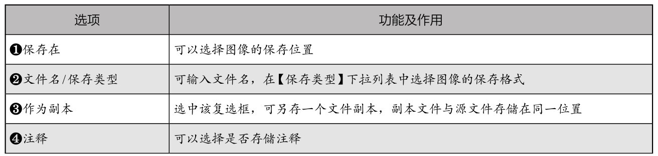 打开一个图像文件并对其进行编辑后,可以执行【文件】→【存储】命令,选择【保存在您的计算机上】选项,保存所做的修改,图像会按照原有的格式存储。如果是一个新建的文件,执行该命令则会打开【另存为】对话框,单击【保存】按钮,如图2-5所示,相关选项的作用见表2-1。