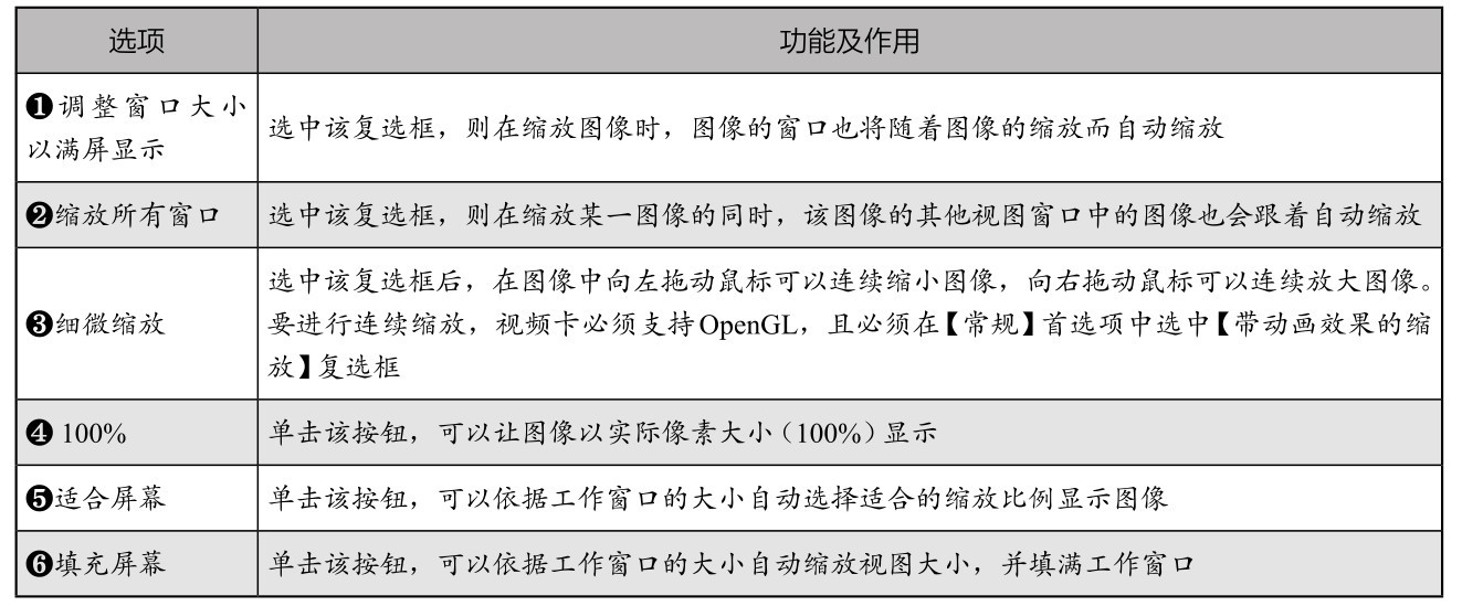 表2-2 【缩放工具】 操作界面中各选项的作用 oEbsBIdYDcivcRMl4g4ZxSq58G1n5pC/nTWiRe5Q6MOnfTpisKpcBLjSInrrE5aj