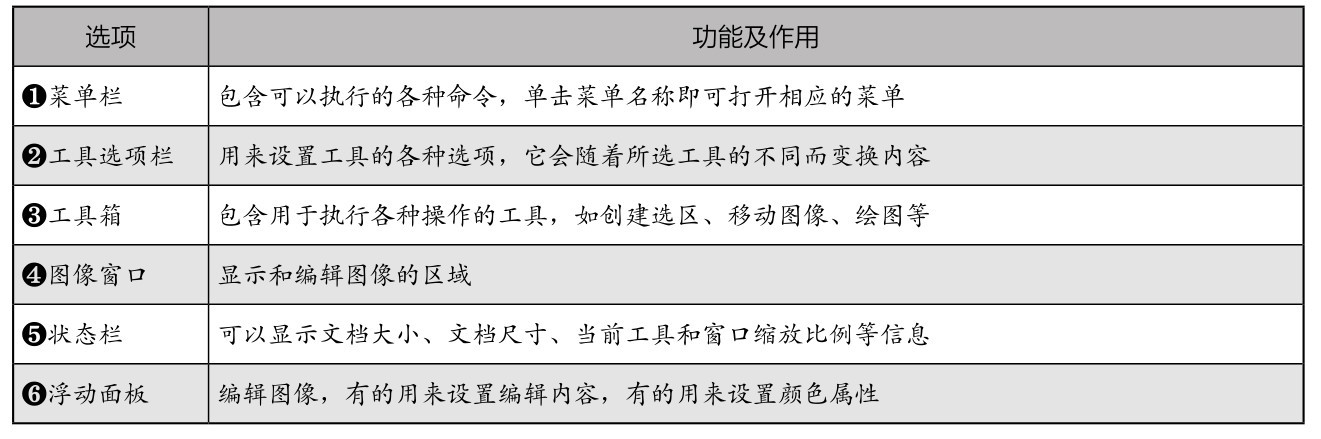 表1-1 Photoshop 2022工作界面中各选项的作用 jGa2GY7dVBrjiMl+IOHv6E6GOQtfW9U7SZ37RNo3l4j6MWKEPQCkEcXMw1ug7JAB