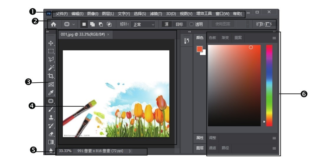 启动Photoshop 2022后,执行【文件】→【打开】命令,打开一张图片,即可进入软件工作界面,下面简单介绍一下Photoshop 2022的工作界面,如图1-9所示,相关选项的作用见表1-1。