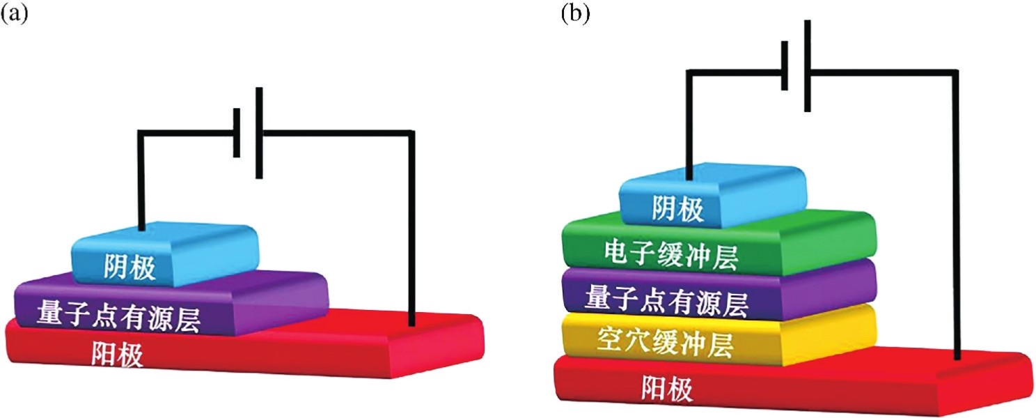 图1.6 (a) 单层量子点发光器件;(b) 多层量子点发光器件