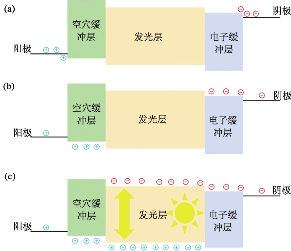 目前对于QLED发光机理的解释一般归类于注入载流子复合与能量转移机制,器件在电场的作用下分为载流子的注入、传输、激子的形成以及复合发光四个过程。