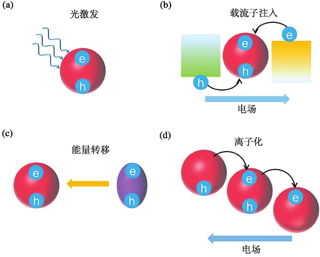 图1.7 QLED中激子的形成方式: (a)光激发;(b)载流子注入;(c)能量转移;(d)离子化