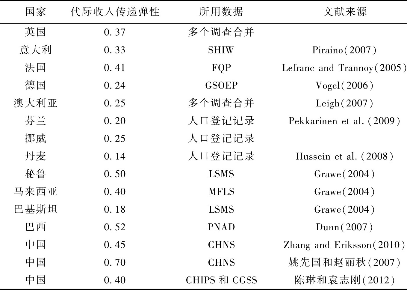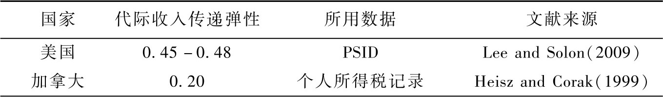 注:(1)此表格中部分数据转引自 Deng et al.(2013)和 Björklund and Jäntti(2009)。(2)所有估计系数均针对儿子和父亲的收入。(3)PSID 指 Panel Study of Income Dynamics;SHIW 指意大利银行(Bank of Italy)开展的 Survey on Household In-come and Wealth;FQP指法国统计与经济研究局(INSEE)开展的 Formation,Qualifica-tion,Profession调查;GSOEP指 German Socio-Economic Panel;LSMS指世界银行开展的Living Standard Measurement Survey; MFLS 指 Malaysian Family Life Survey; PNAD 指Pesquisa Nacional por Amonstra de Domicilios;CHNS 指 China Health and Nutrition Sur-vey;CHIPS指 Chinese Household Income Project Survey; CGSS指Chinese General Social Survey。