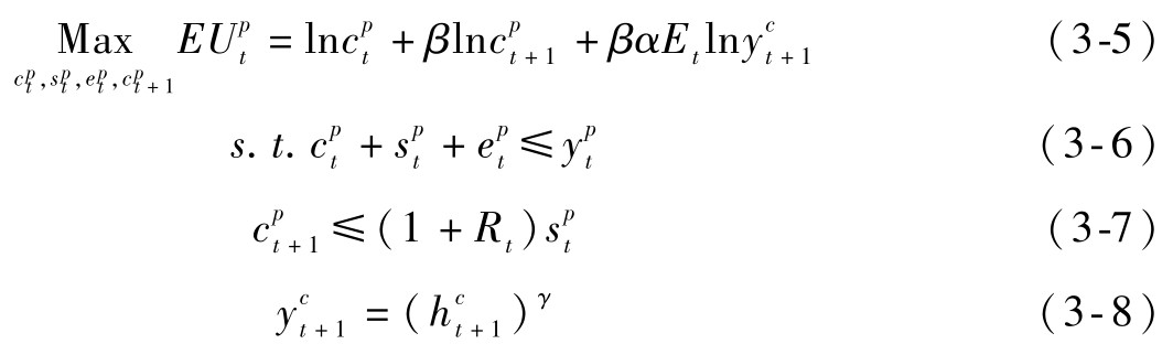 其中,(3-6)式和(3-7)式分别为父母在t期和t+1期的预算约束,(3-8)式代表子女收入的决定过程并间接反映出父母对子女进行人力资本投资的动机。