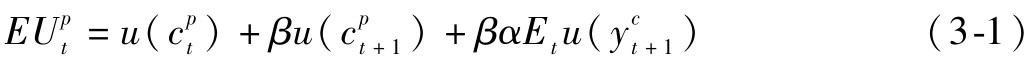 其中,上标p代表父母,上标c代表子女,u(·)为即刻效用(instantaneous utility)函数,符合u′(·)>0、u″(·)<0的常规性质。t 期时,该个体正值中年,取得收入yt,根据自己的期望效用决定其在t期的消费