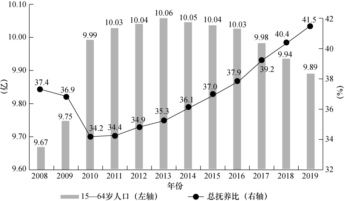 图1-2 2008—2019年我国15—64岁劳动年龄人口数与总抚养比
