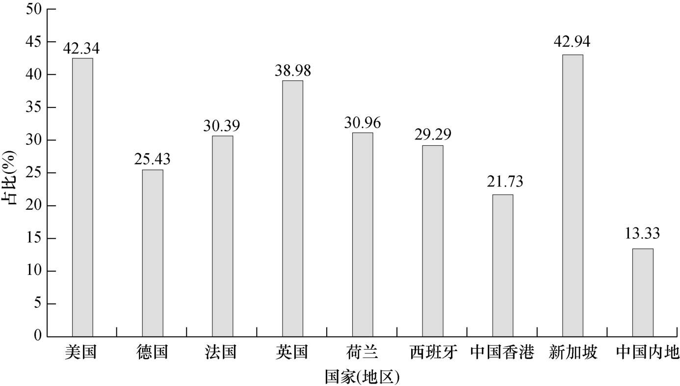 图1-3 2015年中国内地与世界主要发达国家和地区大专以上学历人口占比情况