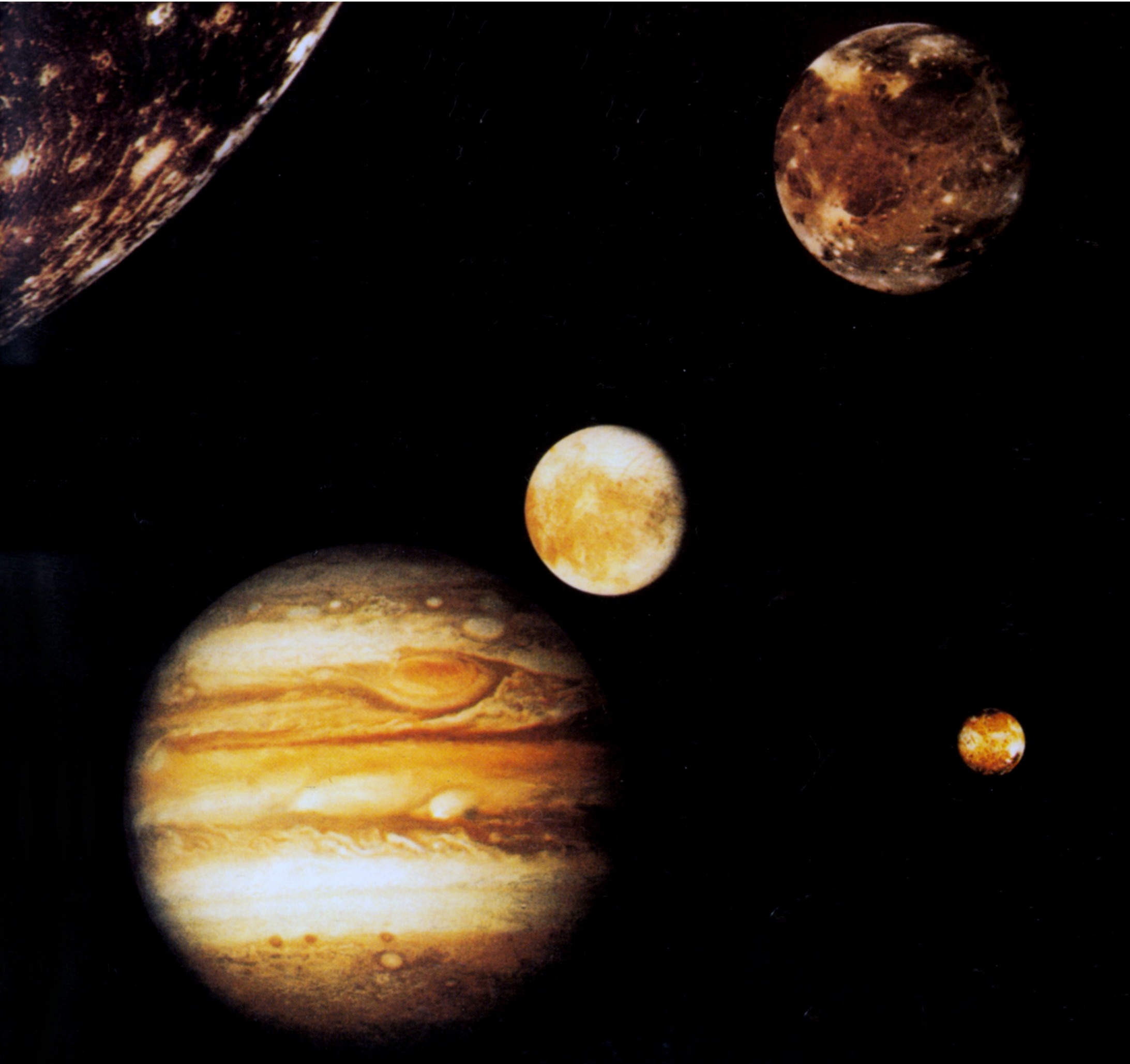 太阳系中最大的行星木星,共有39颗卫星。照片左下是木星,左上为木卫Ⅳ,右上为木卫Ⅲ,右下为木卫Ⅰ,靠近木星的为木卫Ⅱ。这是“旅行者一号”探测器拍摄的拼合照片(不代表真实大小)。四大卫星被命名为“伽利略”卫星。