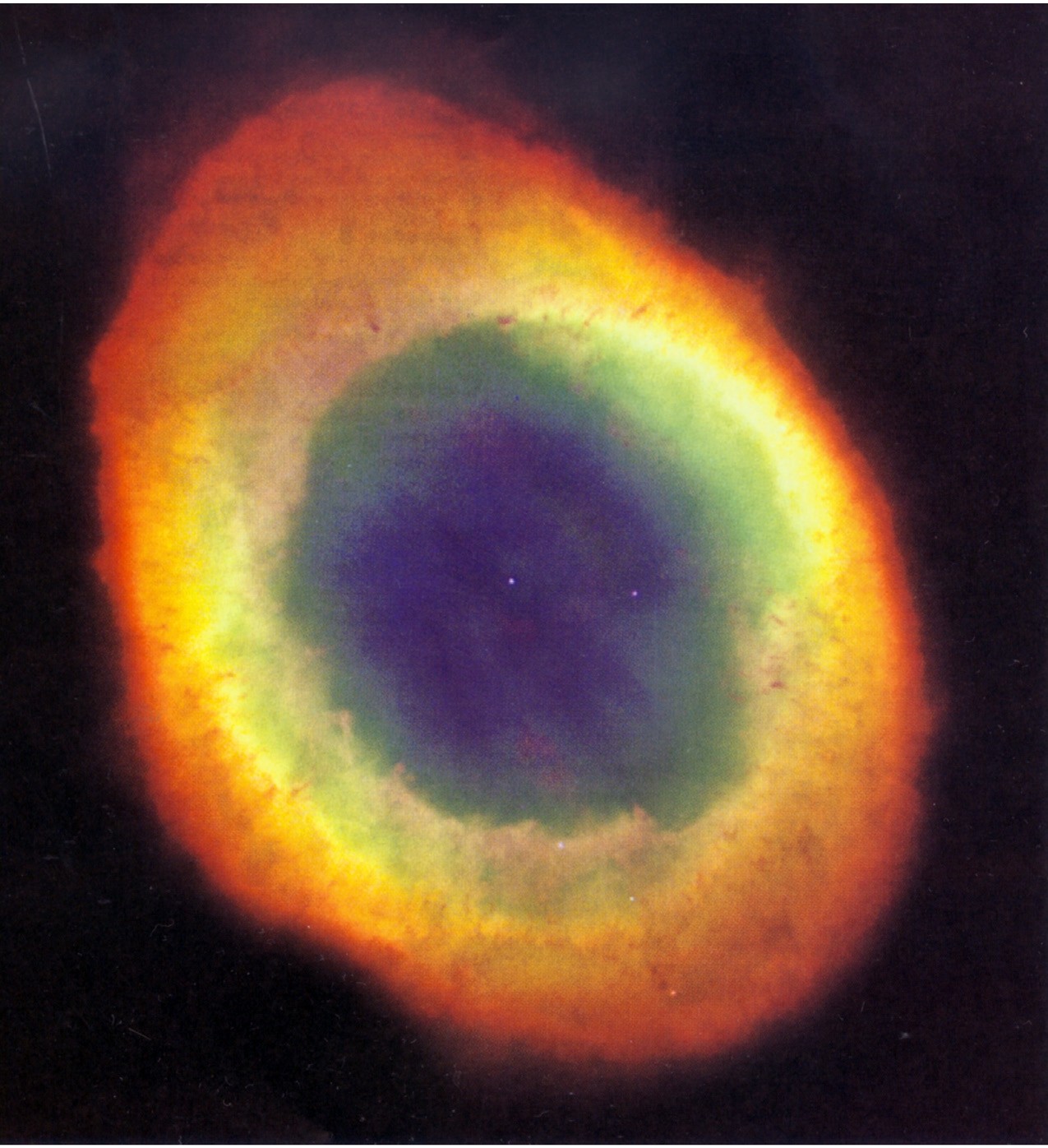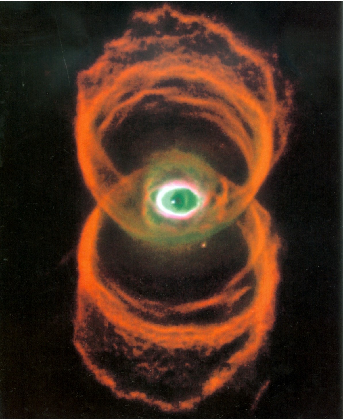 最著名的行星状星云,位于天琴座中织女星附近,距离2 000光年。中心的白矮星放射出均匀而对称的光,使星云的姿态完美对称。天文学家用直径8米的红外望远镜捕摄到了这个星云物质向外扩散的晕环。