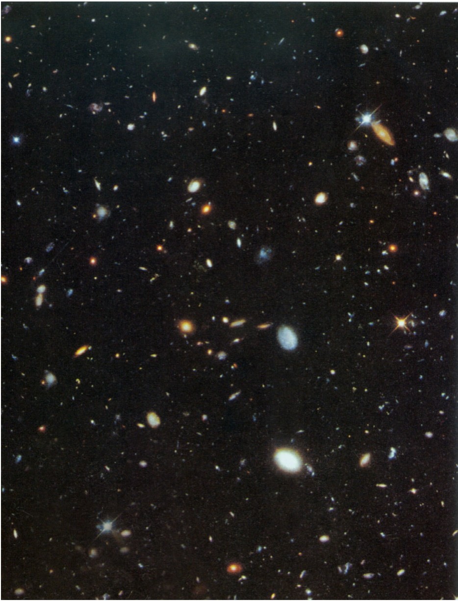 1995年年底哈勃空间望远镜在北斗七星中的一个极小天区拍下了这幅深空探索照片,可以看到有3 000多个星系,距离有100多亿光年之远。这可以说是人类向深远宇宙空间探索的划时代图像。人类对宇宙的探索将深入,深入,再深入,这也是为了去寻找那些最早诞生的星系,以便了解宇宙演化的全过程。