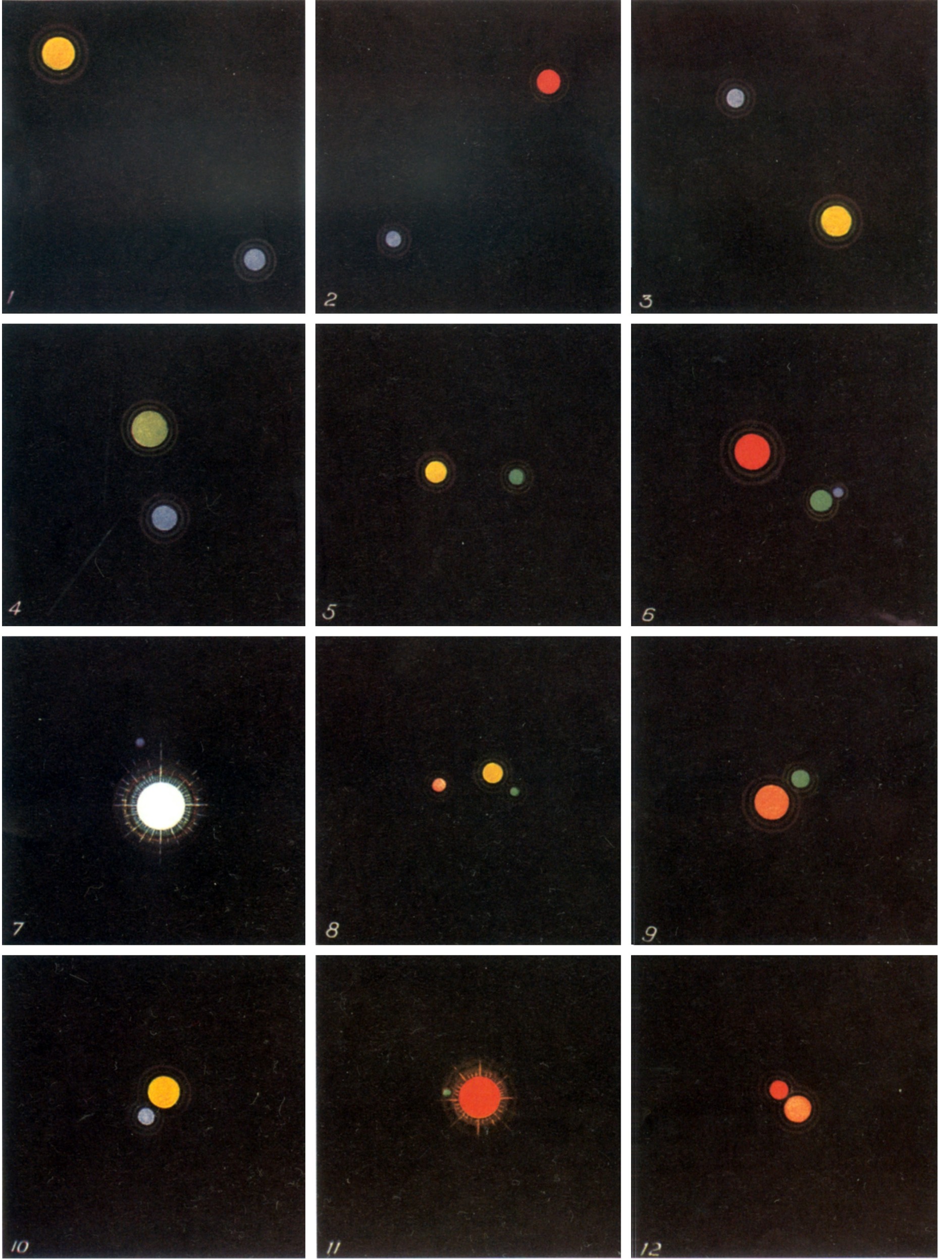 从望远镜中可以看到许多美丽的双星(或三重星……),从颜色对比上显示出双星之美:(1)天鹅座β,(2)英仙座η,(3)大熊座α,(4)天蝎座β,(5)海豚座γ,(6)仙女座γ,(7)猎户座β,(8)仙后座ι,(9)武仙座α,(10)牧夫座ε,(11)天蝎座α,(12)牧夫座ξ。
