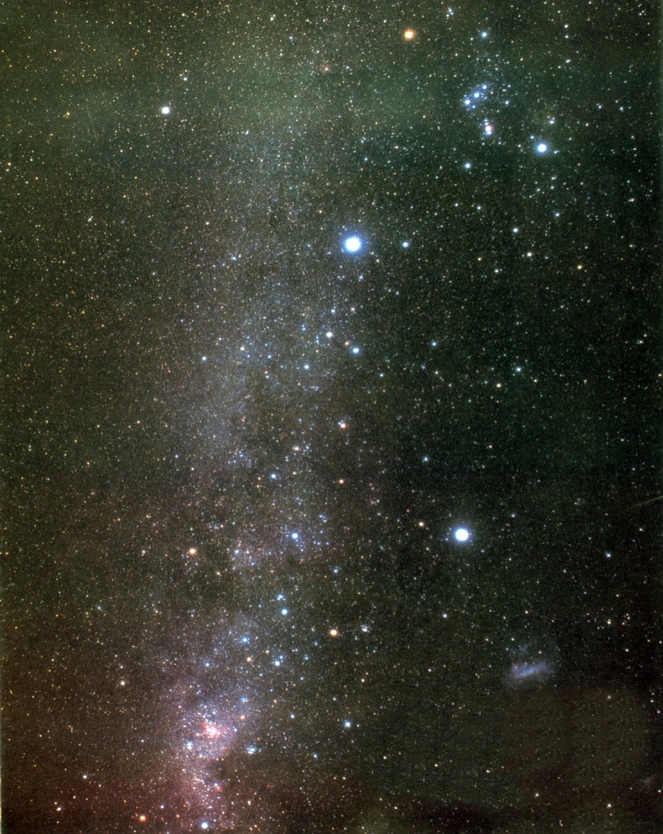 猎户星座高挂天空(右上),星座的左下为全天最亮的星,即天狼星(大犬座),再往下是全天第二亮星,即船尾座的老人星。疏淡的银河顺流向南,左边贴近地平线处是南十字星座。在我国大部分地区只能看到老人星和它上面的星空。在海南一带才能一见南十字星座的全貌。
