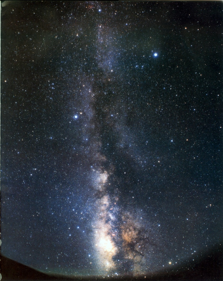 盛夏季节,银河高悬,牛郎星(牵牛星)(左中亮星)位于银河东岸和织女星(右上亮星)遥相呼应,正如唐诗中“卧看牵牛织女星”名句所指。出现在南方地平线上的是银河最辉煌的部分,南斗六星就在这里(银河最亮处的左上方)。