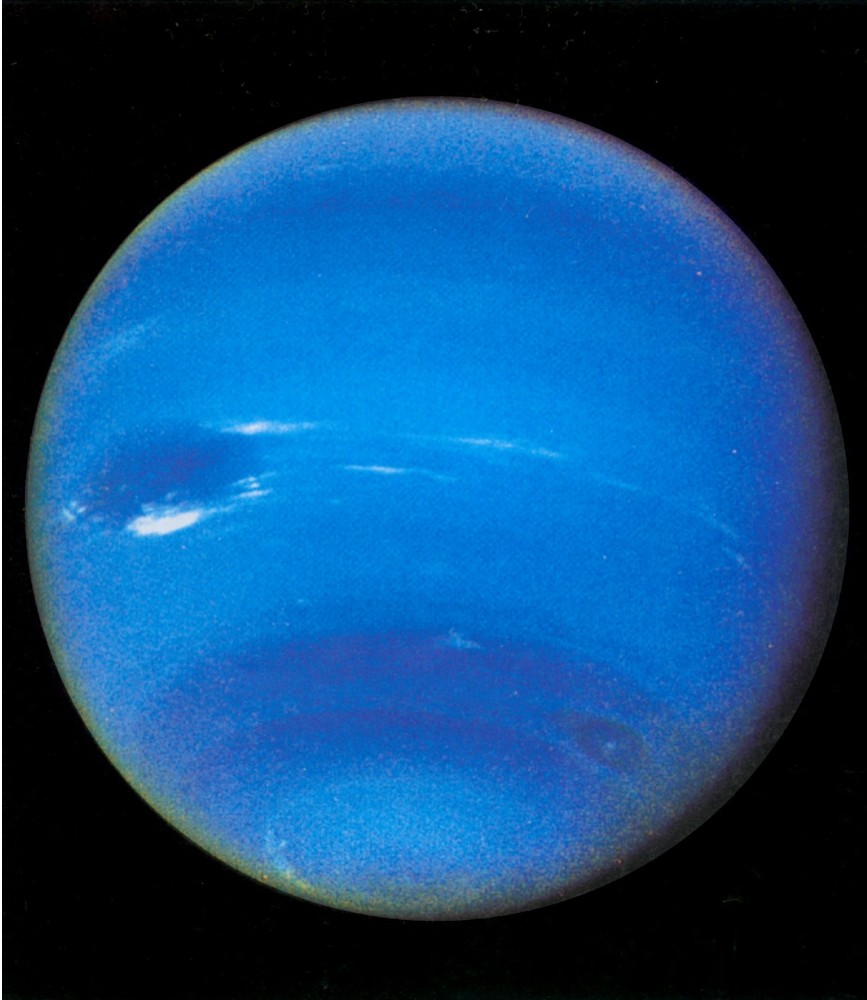 过去用大望远镜也只能把天王星和海王星看成亮星,但1989年“旅行者二号”拍下了海王星这样清楚的照片。在它多风暴的大气中有一个地球大小的黑斑,还有快速奔驰的几缕“白云”。黑斑自转一周约18小时。