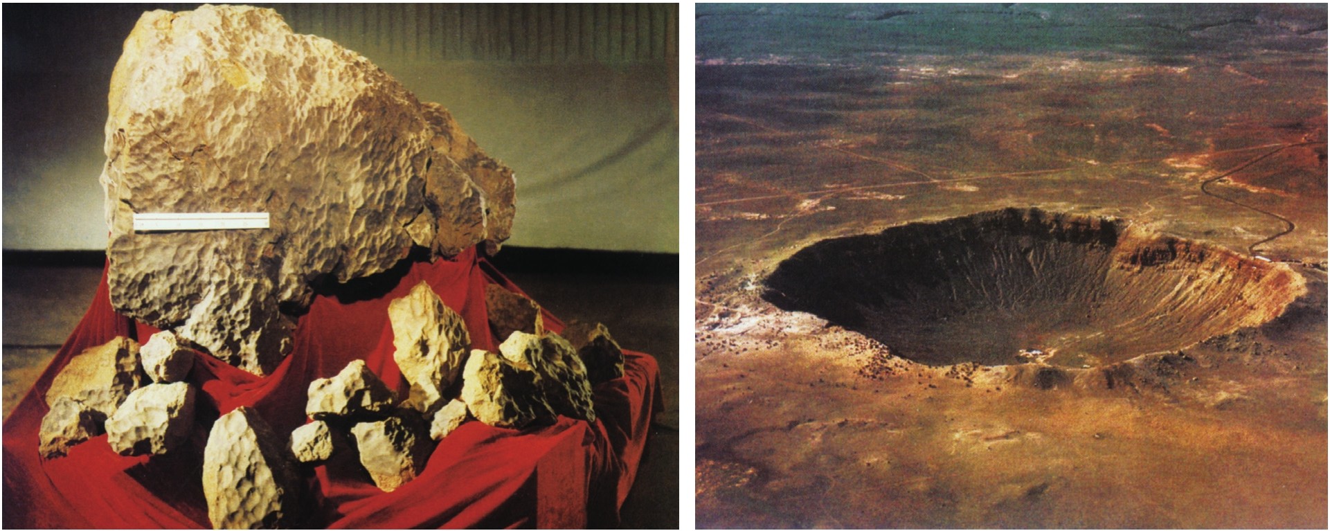 美国亚利桑那州的陨石坑(右图),直径1 265米,可能是几万年前陨石或小行星撞击地球的遗迹。