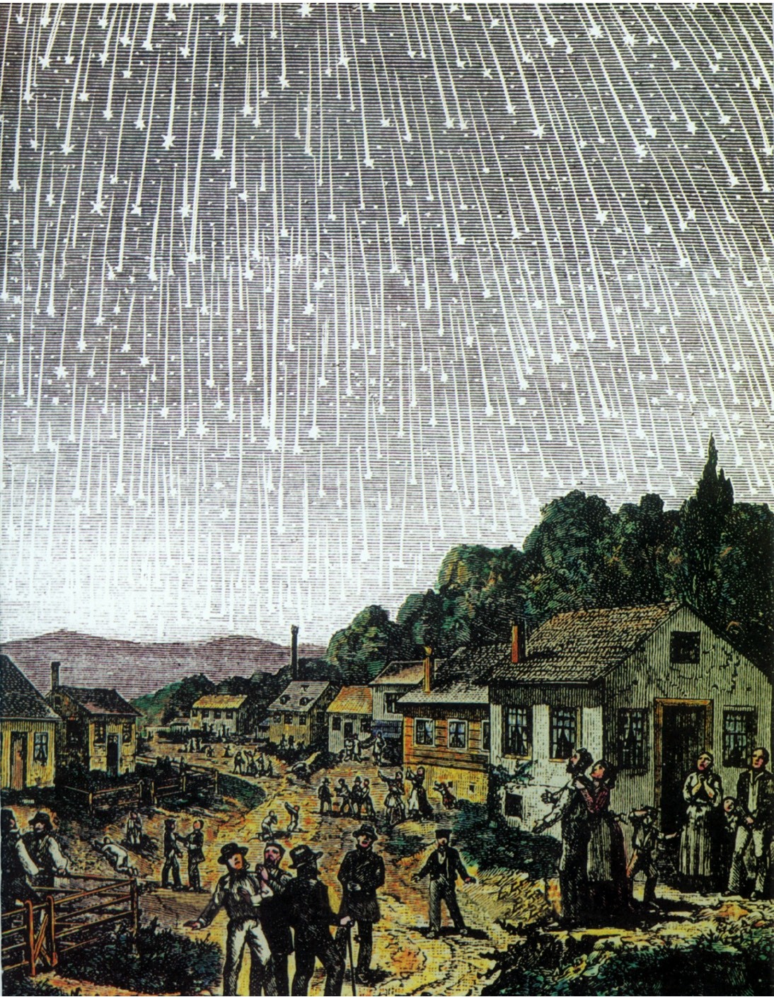 1883年11月13日,在美国波士顿上空出现的狮子座流星暴雨,盛况惊人。(木版画)
