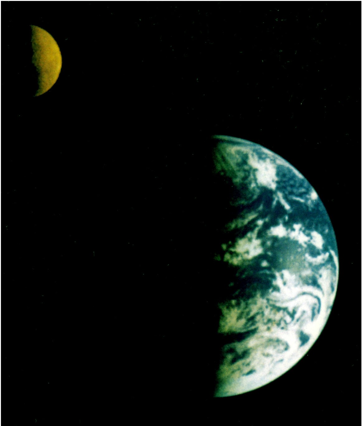 1992年,“伽利略”行星探测器在飞往木星的旅途中回首地球,拍下了这张地(大)月(小)合影,这时离地球有620万千米之遥。你瞧,它们多像一对“双行星”。