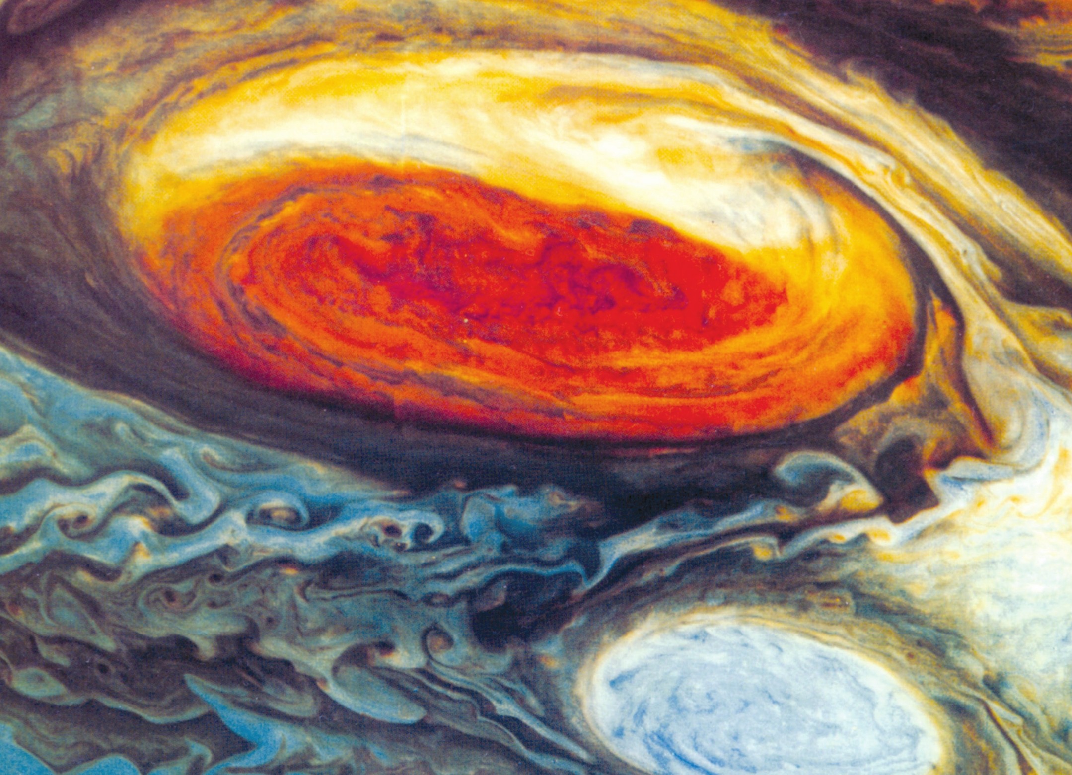 三四百年来,它一直是望远镜观测的重要目标,从没有消失过。1979 年“旅行者一号”探测器从近处拍下了这张清晰照片,它是木星的强大旋涡,足能装得下几个地球!它的大小和颜色也有变化。