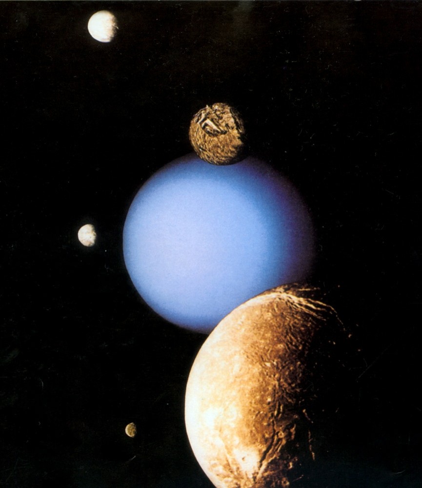 这张由“旅行者二号”探测器拍回的照片中,右边是天王星在中间,天卫Ⅴ在上,天卫Ⅰ在下,左边从上往下是天卫Ⅲ、天卫Ⅳ、天卫Ⅱ。天王星共有21颗卫星和一些环圈。