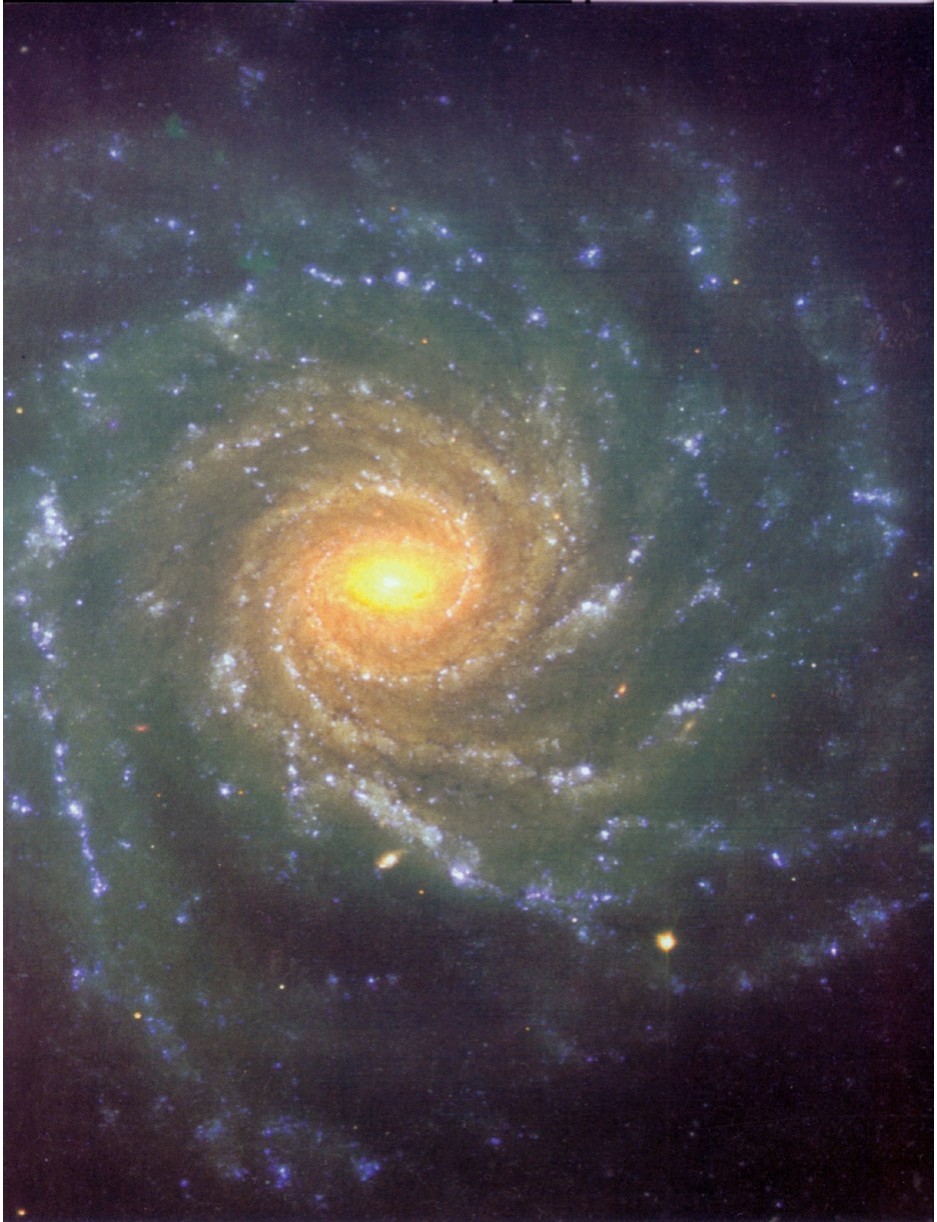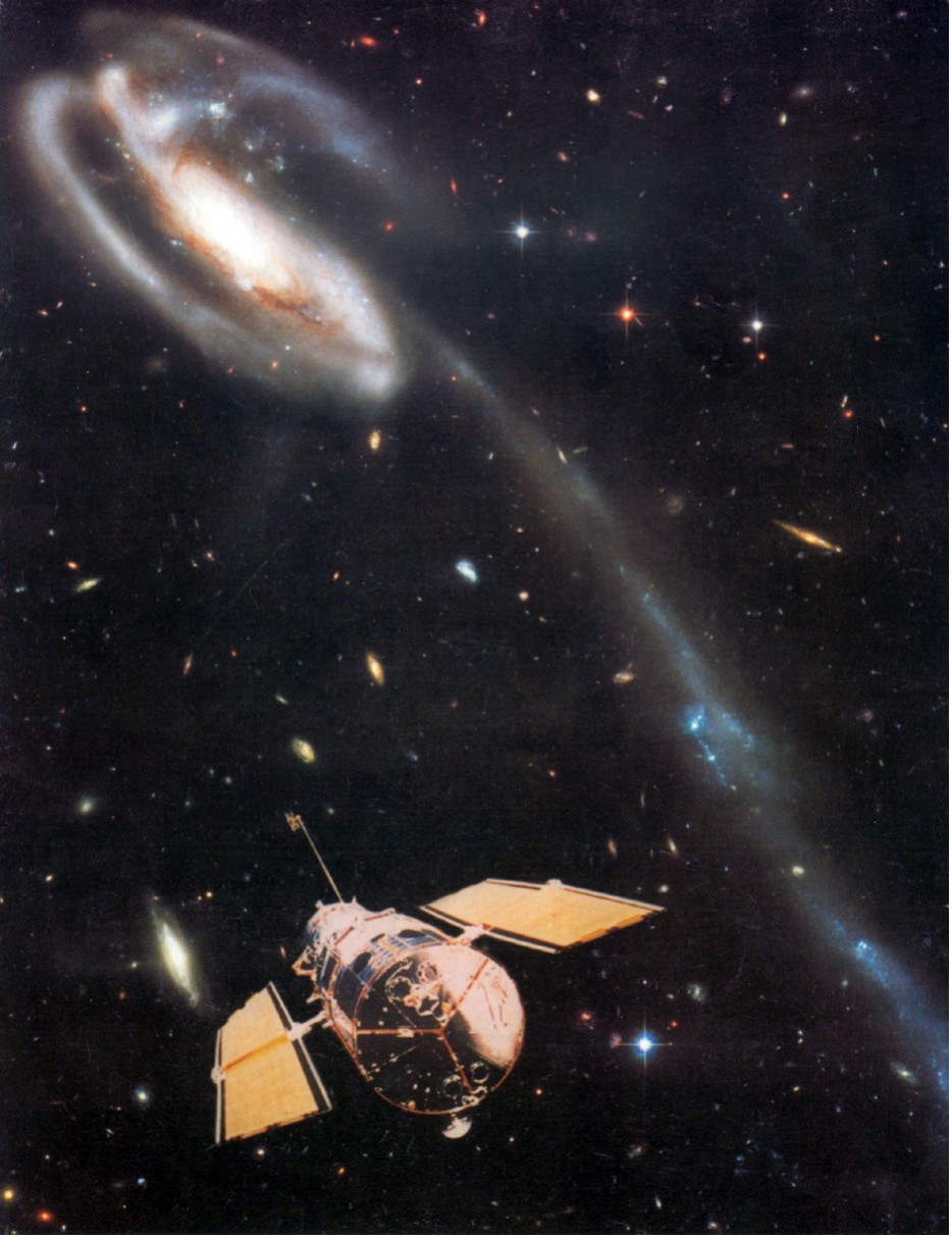 背景照片为天龙星座中的旋涡星系NGC10214,距离约4.2亿光年,它的尾部长约 28 万光年。哈勃空间望远镜2002年3月7日拍摄,露光8小时。
