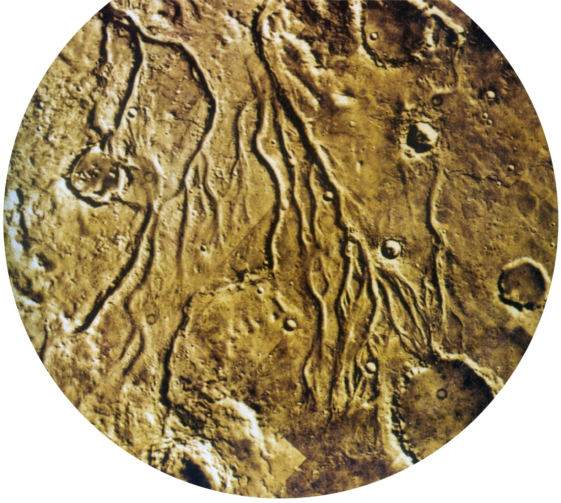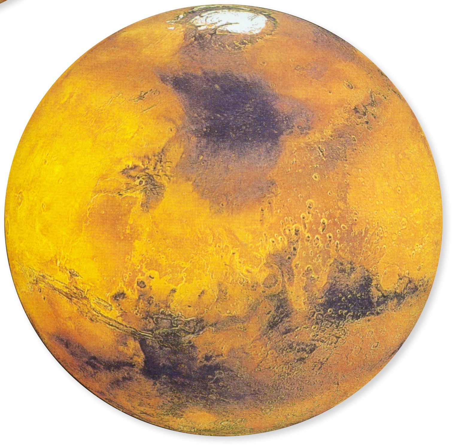 火星是对人类最有吸引力的行星,人类将在21世纪登上火星。火星比地球小,但它有太阳系最高的火山(24千米)。还有长达4 000~5 000千米的大峡谷,从这张用大量照片拼合成的火星图上可以明显看出。