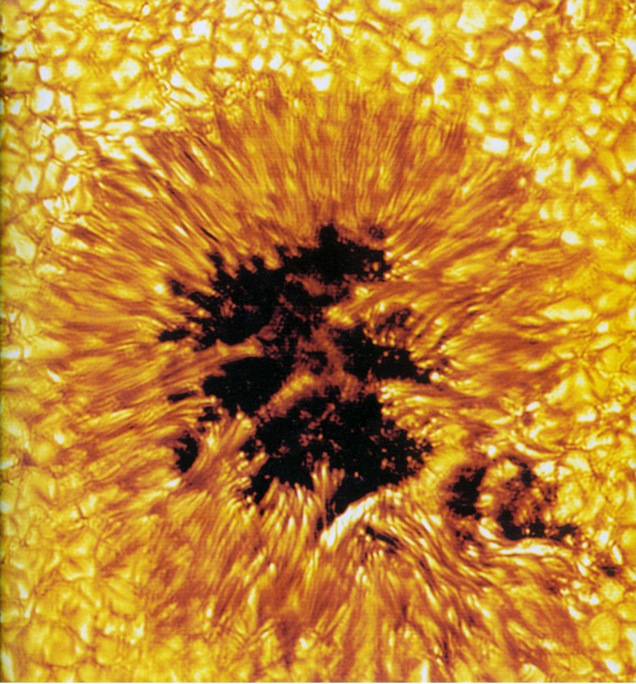 这张异常清楚的太阳黑子照片,显示它的结构和周围的米粒组织。每个“米粒”的直径约有1 000千米,它们上下翻滚,奔腾不息。