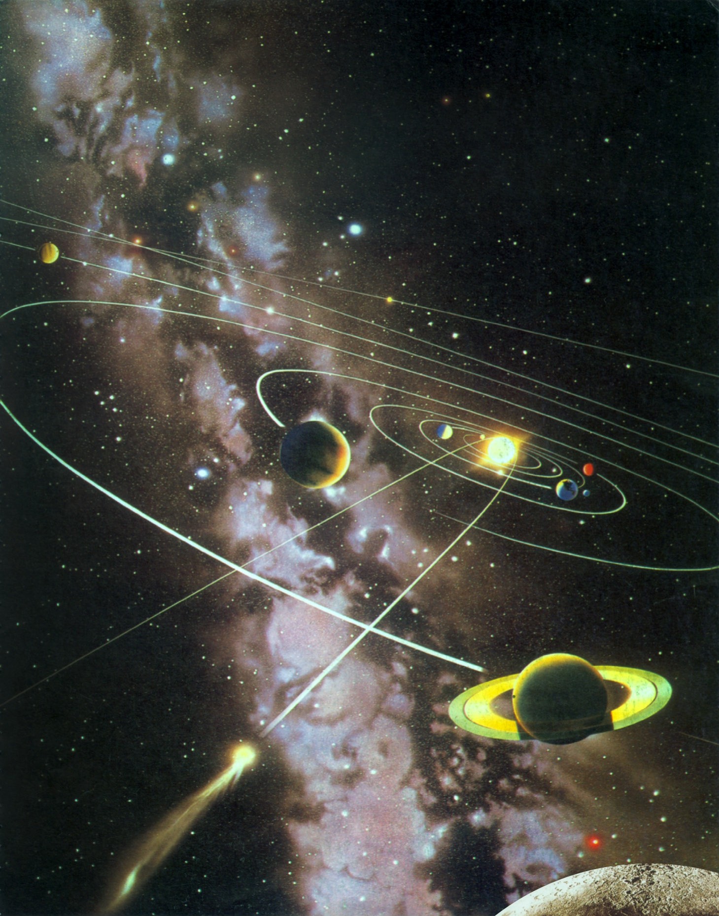 约 46 亿年前,地球和月球以及太阳系的其他天体先后形成,终于有了今天的模样。带环的土星显而易见,在它上方的蓝色行星正是地球。