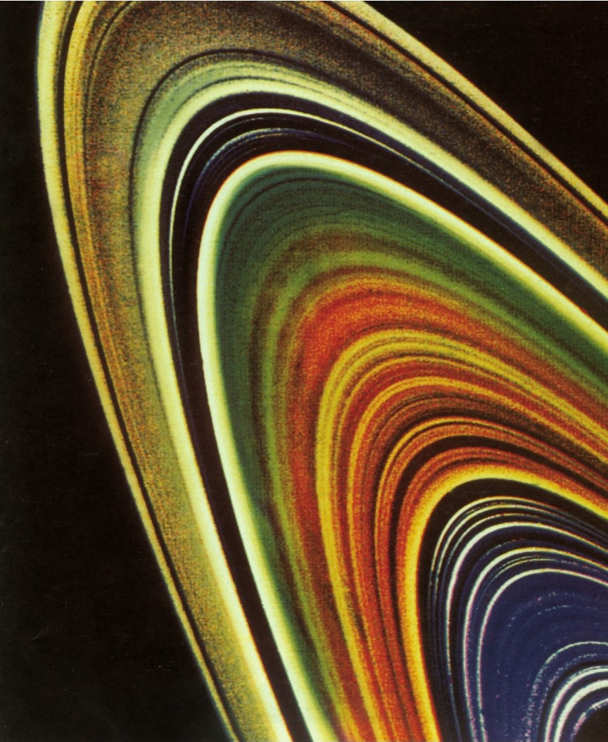 土星光环是太阳系中最美妙的奇景,由无数石块和冰块组成。在1980年“旅行者二号”探测器对其所拍摄的近距照片中,它看起来好像是密纹唱片一样。环宽约6万千米,厚仅一两千米。