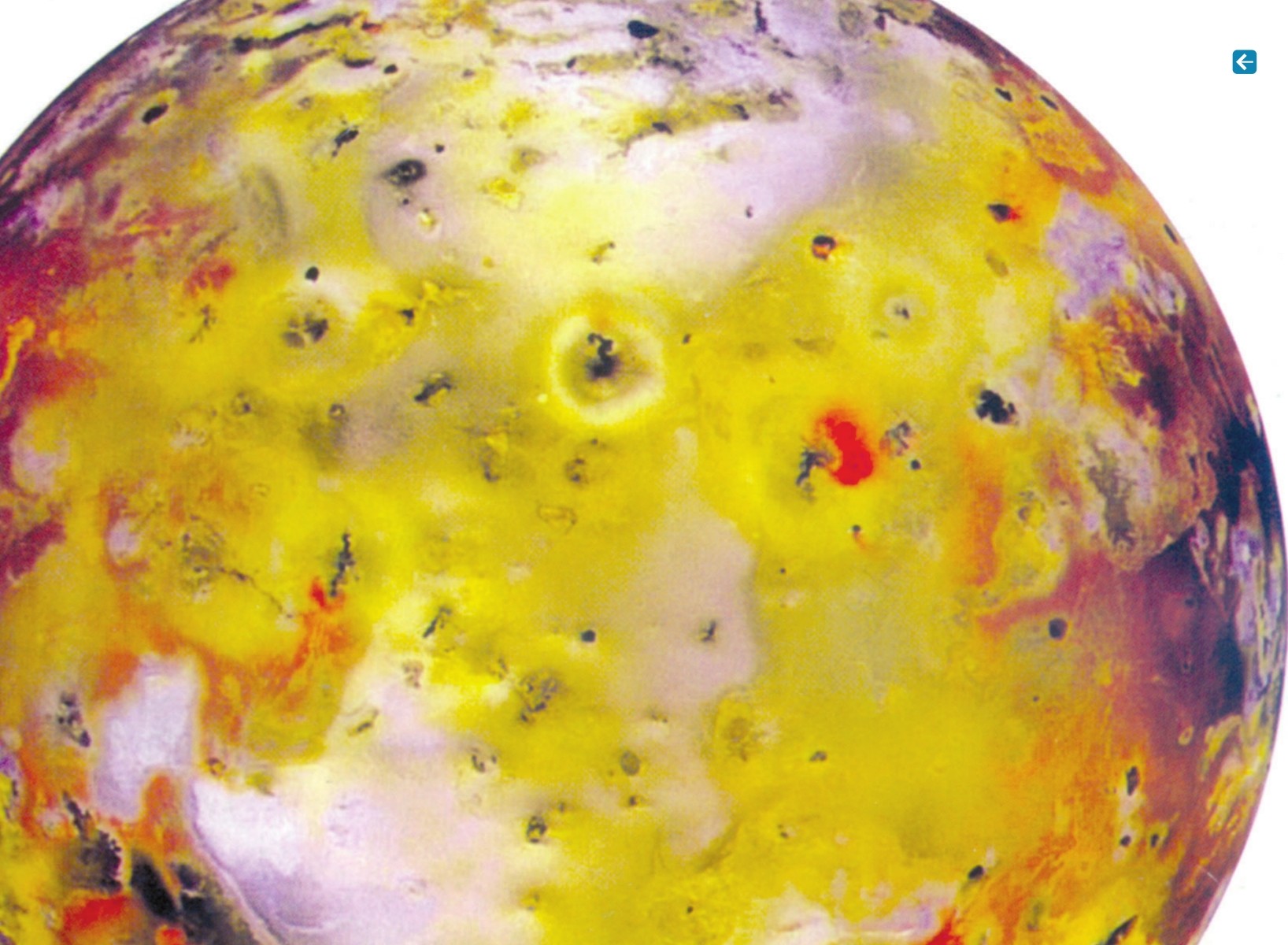“伽利略”探测器从近处拍得的木卫Ⅰ照片。那里有大量的火山口,并且还有不少仍在喷发。