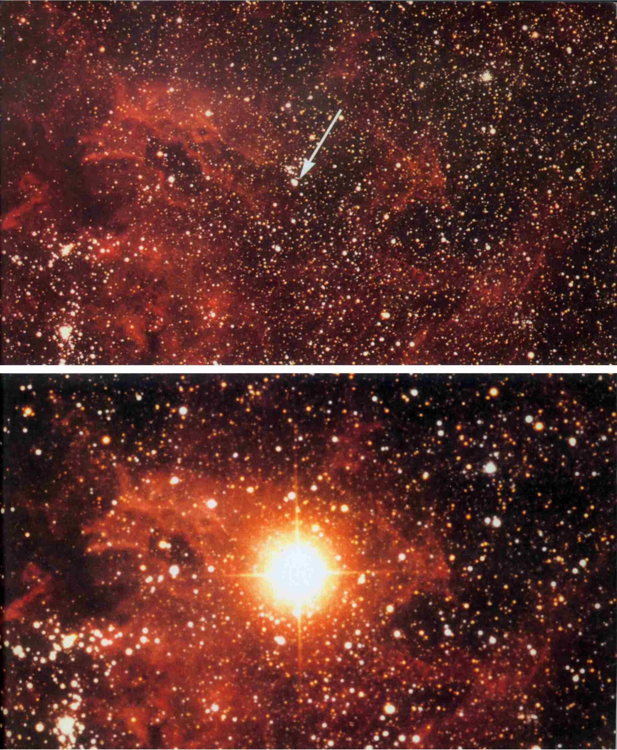 这是人类在将近400年来首次发现了肉眼可以看到的超新星,出现在大麦哲伦星云中,成为20世纪最重大的天文发现之一。它发出强大的紫外射线和X射线,成为天体物理学中重要的研究对象。该图是这颗超新星爆发前(上图)和爆发后(下图)的照片。