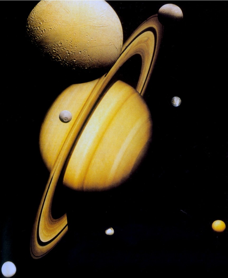 带着宽大光环的土星显示出它不平凡的美姿。这是用“旅行者一号”拍摄的近距照片与几颗卫星照片拼接成的母子合影。在土星上的是土卫Ⅰ,上方的大卫星是土卫Ⅱ,右边是土卫Ⅳ……现知土星共有30颗卫星。