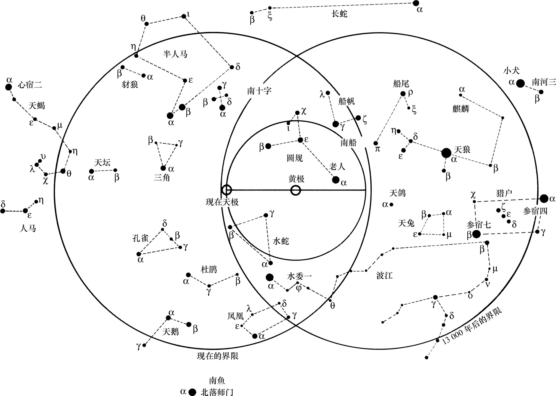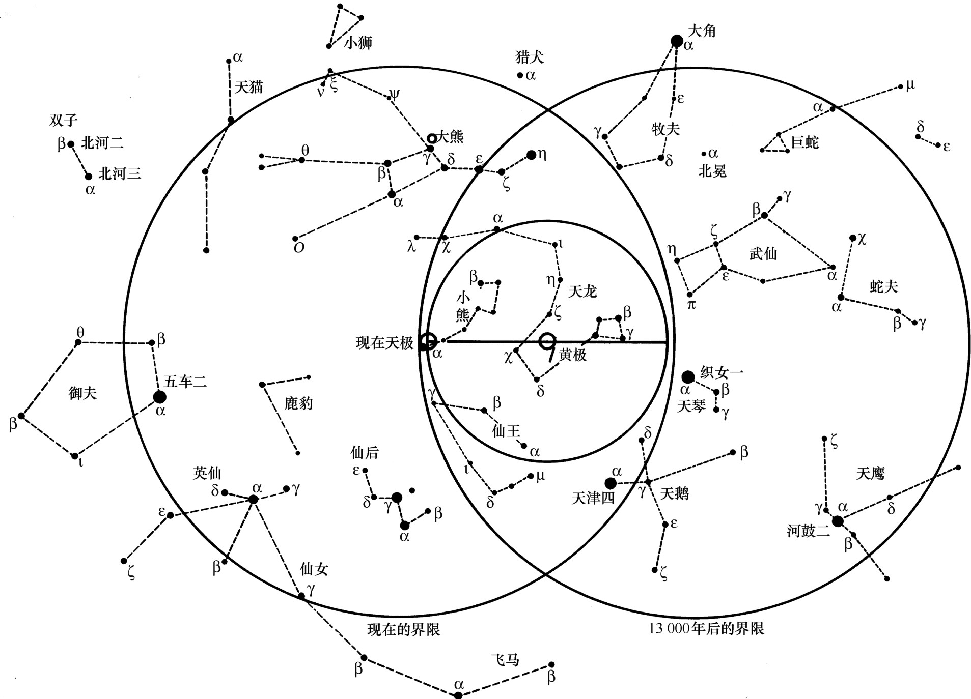 现在的或13 000年后(或13 000年前)的情形。这界限圆的中心绕黄极转动,图上绘出北极的轨道,这样就可以绘出这两个时期之间某一时期的界限圆。