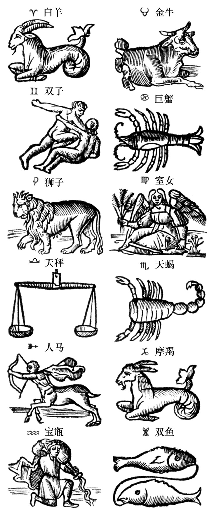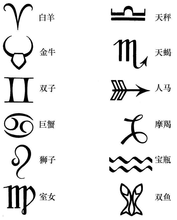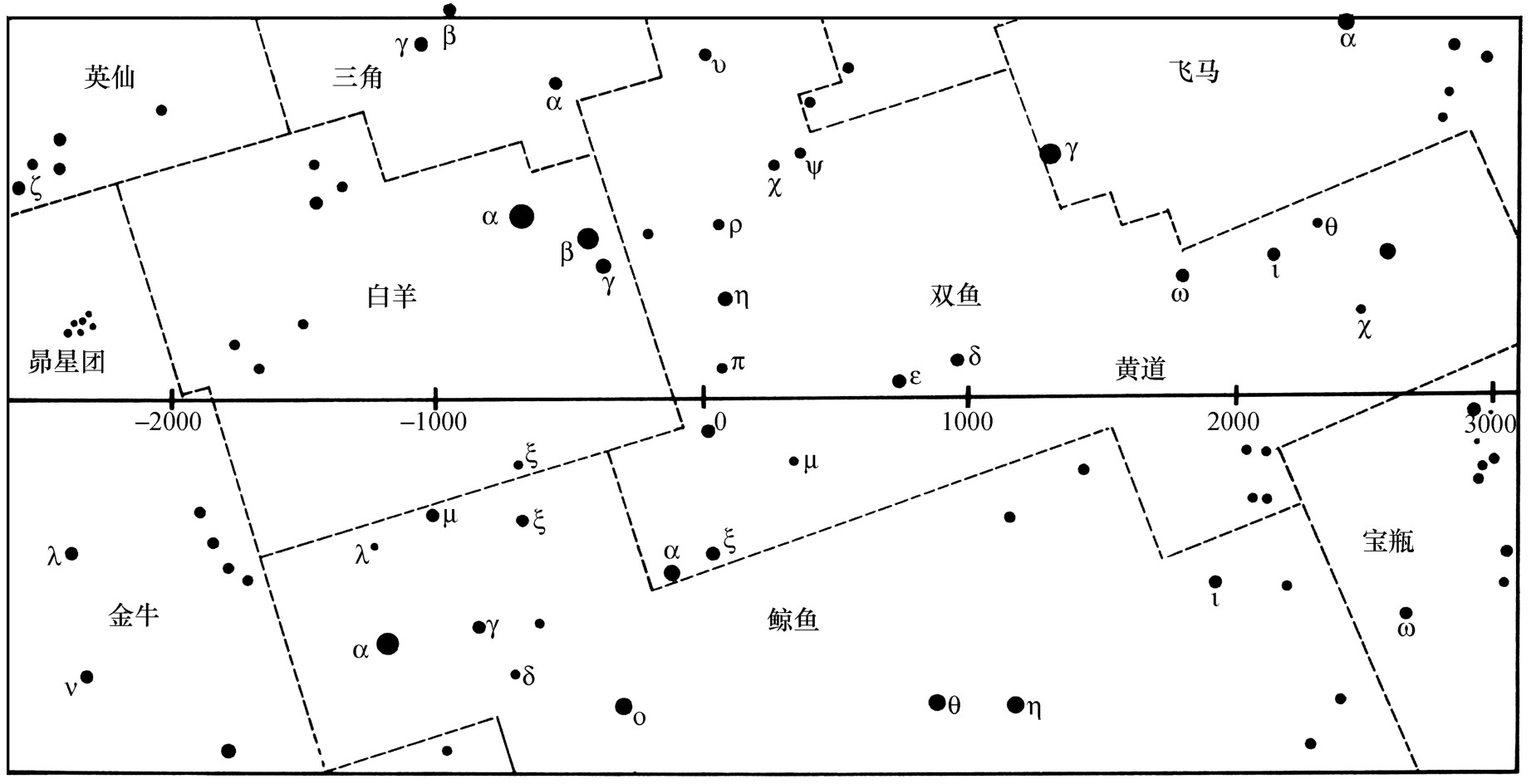 太阳周年视行所经过天空里的恒星,在不可稽考的远古时期便被分为 12 群,名叫 黄道星座 。2000年,太阳经过赤道时遇到的第一个星座叫作 白羊座 。按照由西向东的次序,第二个星座叫 金牛座 ,第三个是 双子座 ,以后三个是 巨蟹 、 狮子 和 室女座 ,其余六座是 天平 、 天蝎 、 人马 、 摩羯 、 宝瓶 和 双鱼 (图66)。