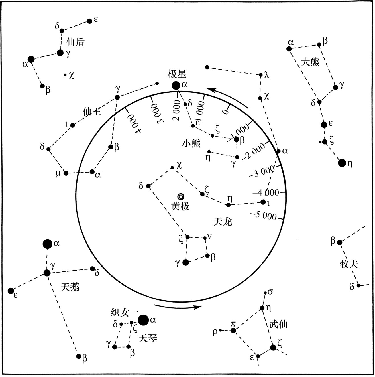 在25 780年内它走了一个圆周。图上注明公元前5000年至公元4000年的北极位置,这样也可以看出地轴方向的长期变化。